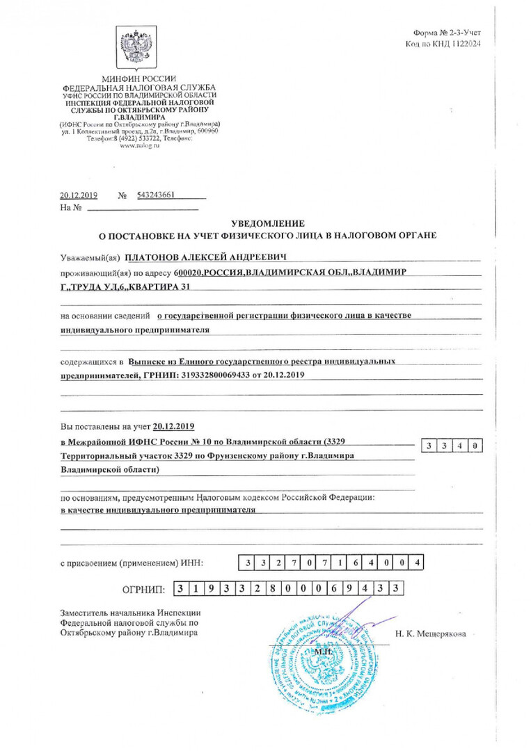 ОГРНИП: 319332800069433